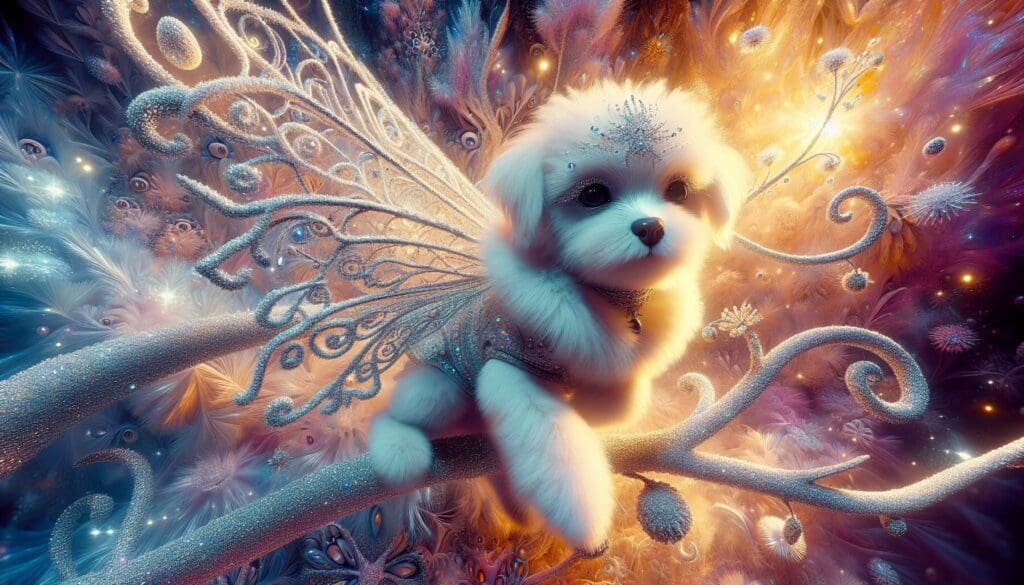 In the breathtaking wonderland of The FibonacciBlacklightQuantumBloomFrozenLuminescence, an extraordinary creature graces the landscape. It is a delightful blend of a maltipoo dog, rabbit, and fairy. As it roams, the charm of a rabbit and the ethereal essence of a fairy combine to create a captivating spectacle. The scenery in this