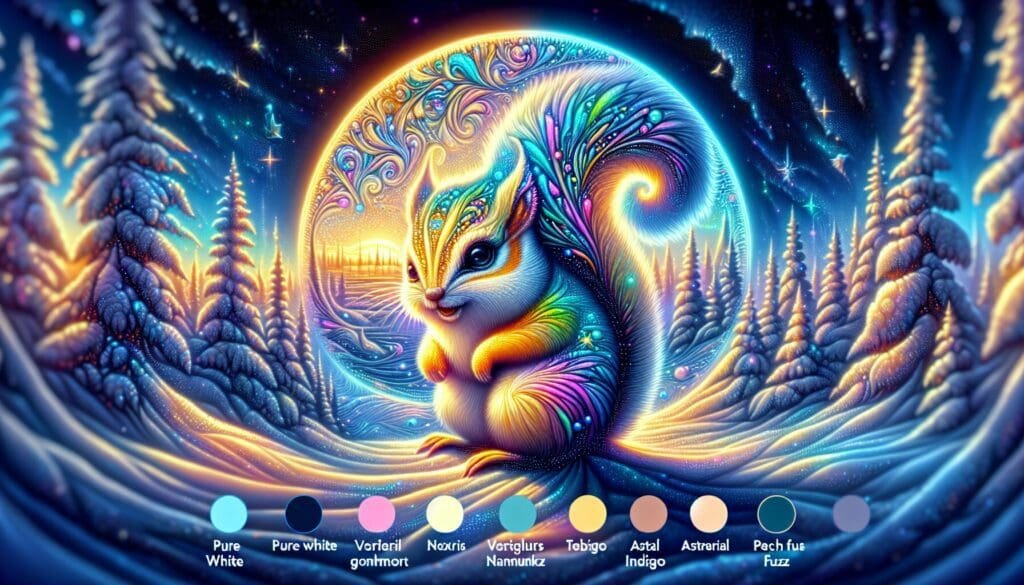 In an enchanted winter realm, a charming creature gracefully appeared, a blend of chipmunk and parrot. Its presence was utterly captivating, infusing the surroundings with warm, neon sunlight that glimmered like gold. It possessed a surreal beauty, with its body masterfully adorned in a whimsical fusion of colors inspired by