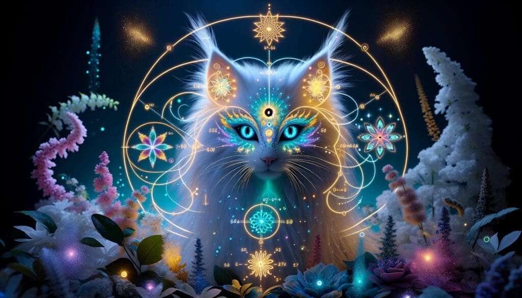 In the magical realm of The FibonacciBlacklightQuantumBloomFrozenLuminescence, there exists a captivating creature, a fusion of Persian cat, beta fish, and fox. It roams freely, spreading enchantment and beauty wherever it goes. With its stunning neon golden citrine lighting, the creature illuminates its surroundings in a radiant glow. Its appearance is
