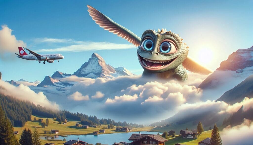 In the clear blue sky above the picturesque Swiss Alps, a captivating creature soars gracefully. It is a wondrous amalgamation of a passenger jet, an eagle, and an alligator, combining their unique traits into a marvel of nature. With big, expressive eyes that sparkle with mischief and curiosity, this enchanting