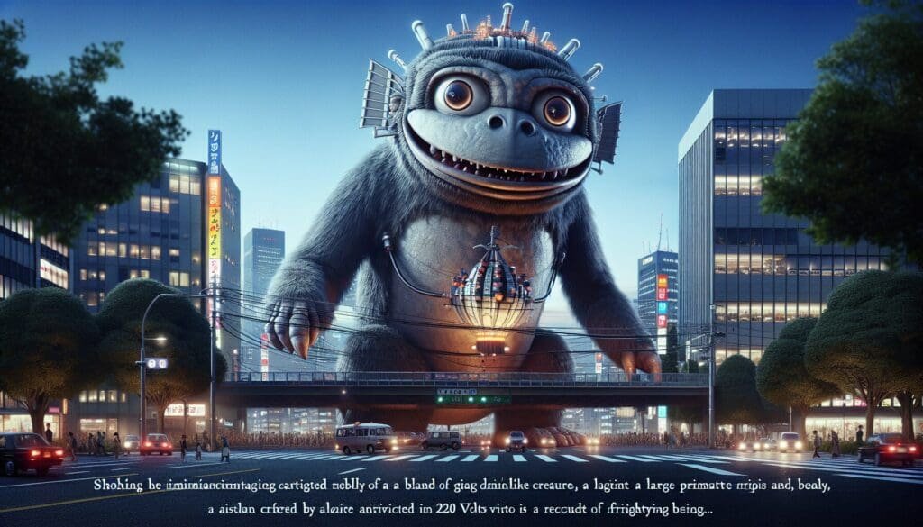 In the bustling city of Tokyo, a whimsical creature emerged from the depths, a delightful blend of gentle qualities from Godzilla, King Kong, and a 3-wing airplane. With oversized, friendly eyes and a youthful demeanor, this unique amalgamation instantly captured the hearts of onlookers. One day, while the creature innocently