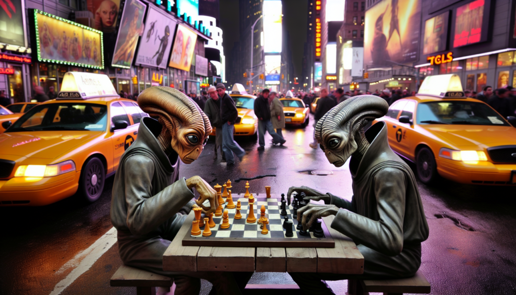 In the heart of Times Square, amid neon lights and bustling taxis, the Predator and Alien play chess, their monstrous figures tensely locked in intellectual combat. This otherworldly scene marries the familiar with the fantastical, humanizing these iconic film creatures in an intense, cosmic battle of wits. Interesting Facts: The