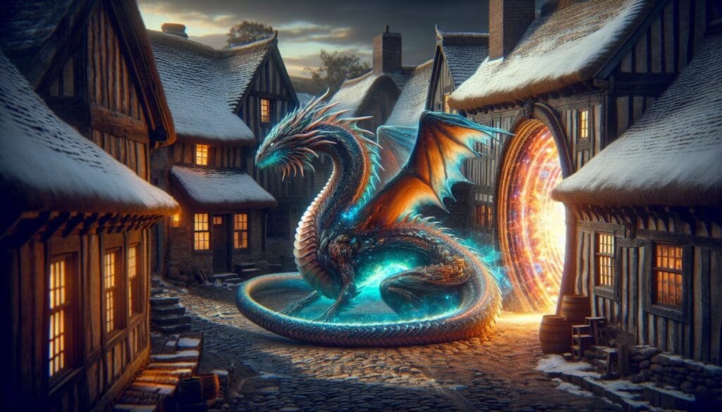 The dragon descended, a surreal embodiment of mythical elegance and raw power. Its scales glistened with an iridescent sheen that refracted the settling twilight into a riot of color across the ancient village. Its wings, massive canopies of strength, unfurled partially as it landed, whipping up currents that swirled dust