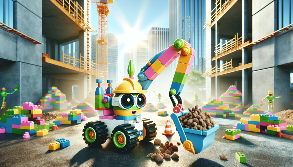 In sunny Los Angeles, a unique creature shaped like a Lego construction worker was hard at work. Perched high on a vibrant toy crane, it maneuvered a large capable shovel with ease, moving an expansive mound of dirt. This distinctive figure, with sturdy outer layers akin to robust construction blocks,