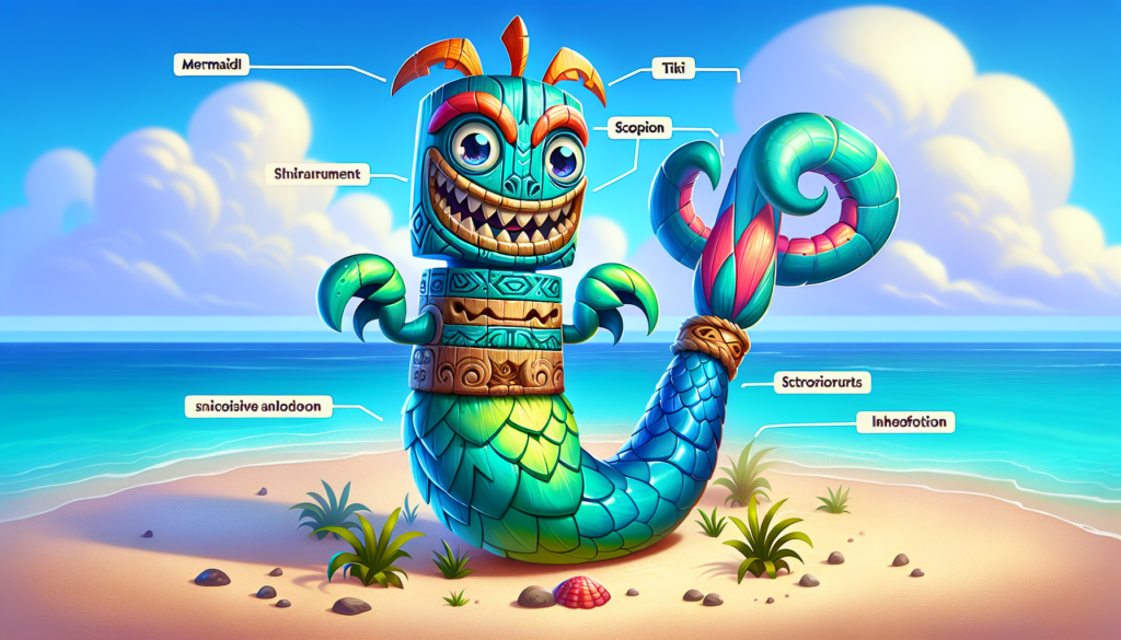 In the heart of a vibrant tropical paradise inhabited by a marvelous mosaic of whimsical creatures stands Tikiki. An amusing mélange of a mermaid, scorpion, and tiki totem, Tikiki rests, basking in the balmy island sun. His body, a beautifully crafted tiki totem, colorfully painted and rich with Polynesian carvings,