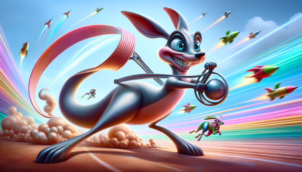 With a twinkle in its eye and pure mischief across its grin, the giant, slingshot-tailed kangaroo stands ready to sprint. Encased in a gleaming silver bullet skin, it patiently coils, loaded with boundless potential. Amidst a rainbow-hued racetrack bustling with mythical creatures and unseen, cheering crowds, it waits, poised for