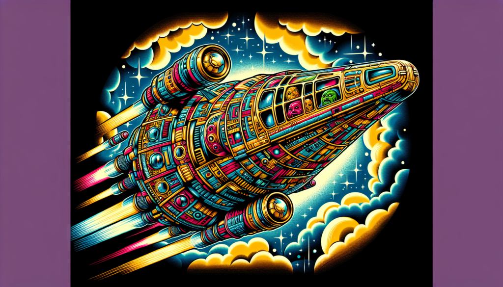 Surrounded by stars, a vibrant retro spaceship paused in high-definition. Airbrushed art gave it a vintage charm, whilst the caricature faces in windows elicited chuckles. Its upward journey was echoed by the phrase May the Force Be With You. On the brink of exploring unknown space, the journey began. Interesting