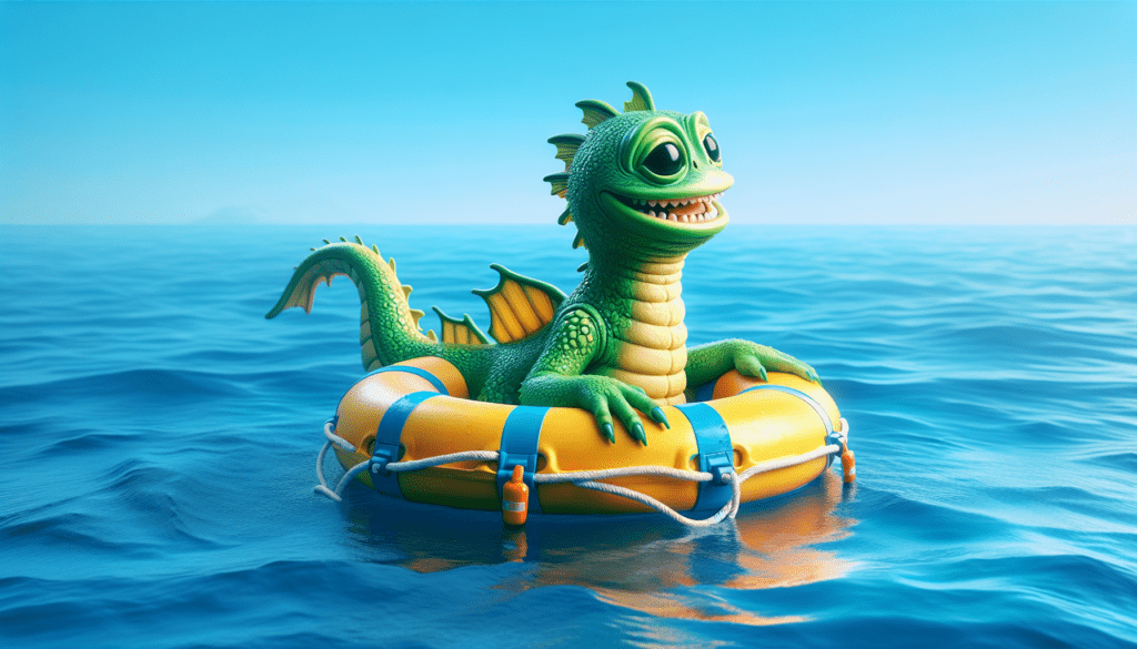 Floating amidst the cerulean ocean, a whimsical creature named the Godzill-Floatee bobbed helplessly, reflecting a comical distress. A mishmash of Godzilla, a life raft, and a rescue ring, his green scales met bright yellow and safety orange, offering an amusing yet compassionate spectacle in a hyperrealistic pop style. Interesting Facts: