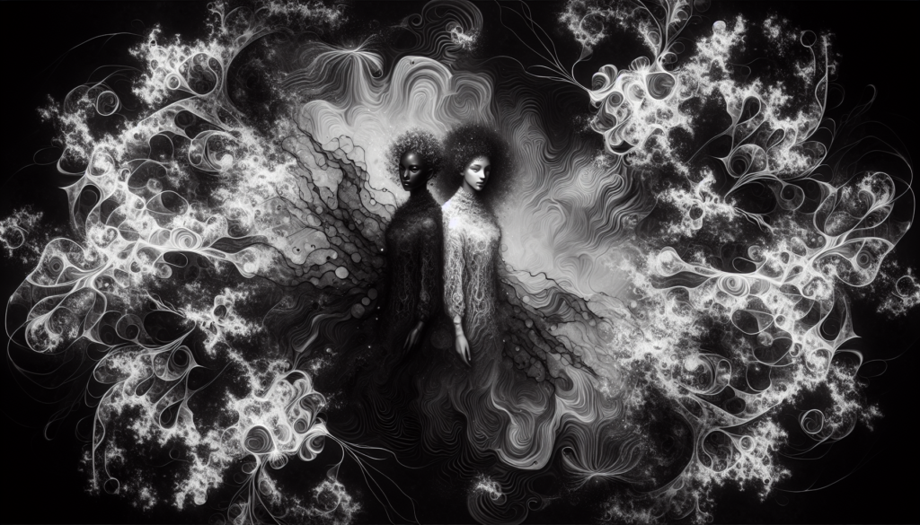 In a monochromatic world, two women of diverse cultures rise, intricately handcrafted, in a tableau of equality. Surrounded by hazy Penrose tribar-inspired shapes, they stand proud amid the smoky whorls of alcohol ink marking the raw dark paper, their story told in sketchy scribbles layered with understated elegance and dark