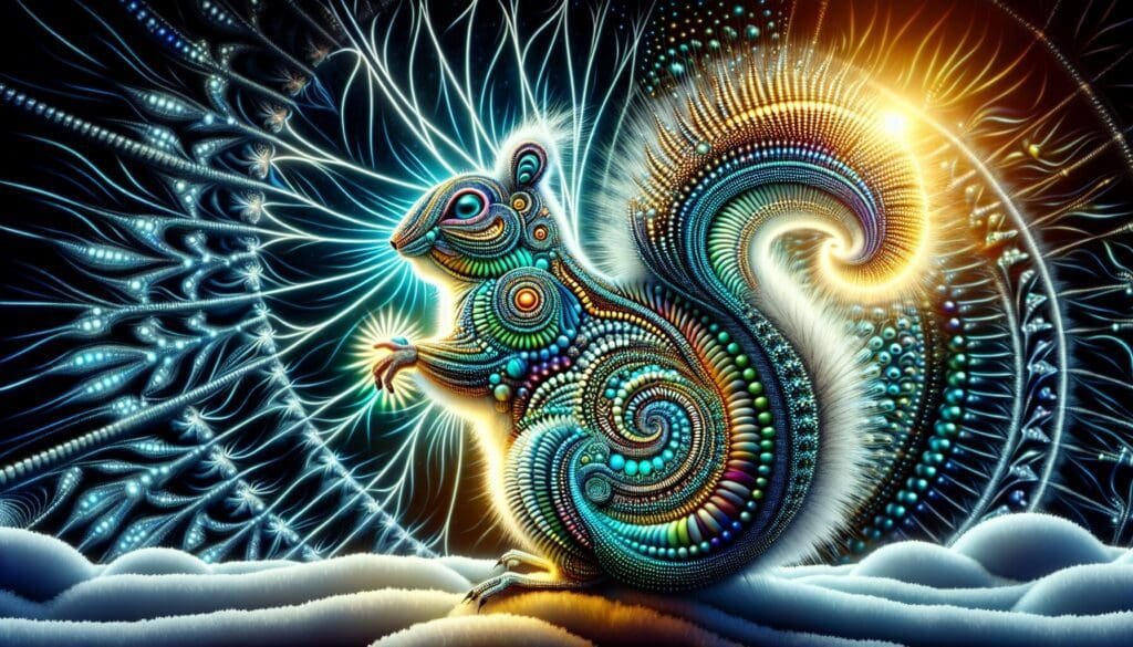 In a world of enchantment, where imagination knows no bounds, a whimsical creature came to life. It was a fusion of a chipmunk and a parrot, a fantastical creation that defied the laws of nature. Its vibrant coat was adorned with a mesmerizing Fibonacci pattern, glowing under the mystical blacklight