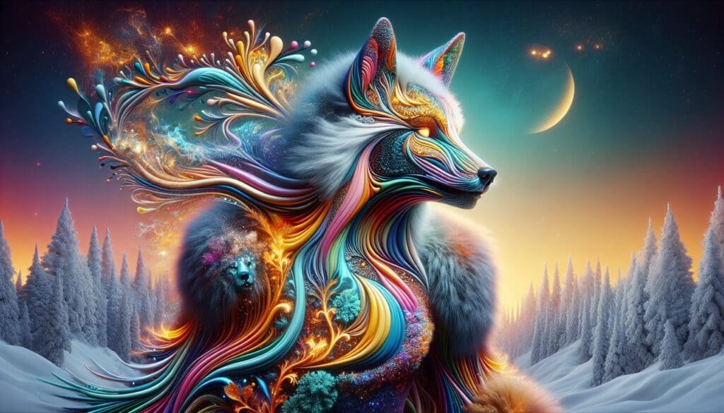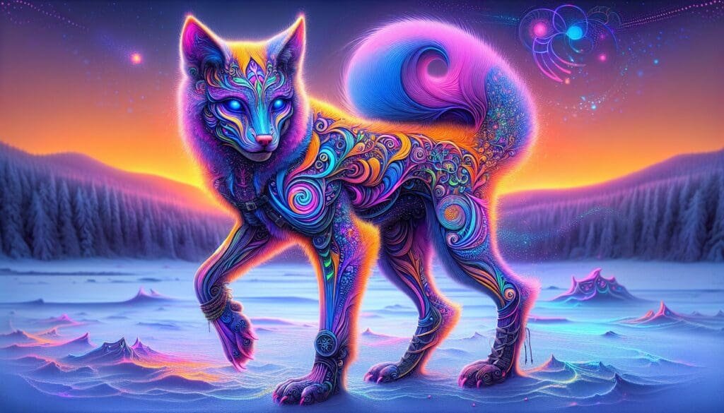 In a frozen realm, a captivating creature emerges, embodying the elegance of a wolf, the grace of a feline, and the vibrant hues of a neon citrine sunrise. Its fur glistens, adorned with enchanting Fibonacci patterns, while the ephemeral glow of blacklight luminescence bathes it in an ethereal radiance. Playful