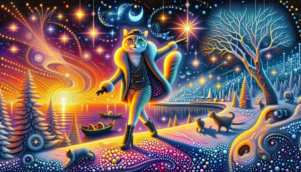 In a winter wonderland infused with a kaleidoscope of colors, a mischievous cat gracefully struts, its shadows twirling with vibrant lights. The frozen landscape, adorned in shades of pure white, verdigris, astral indigo, and peach fuzz, creates a stunning contrast against the felines urban fashion-inspired attire. Every detail, meticulously crafted