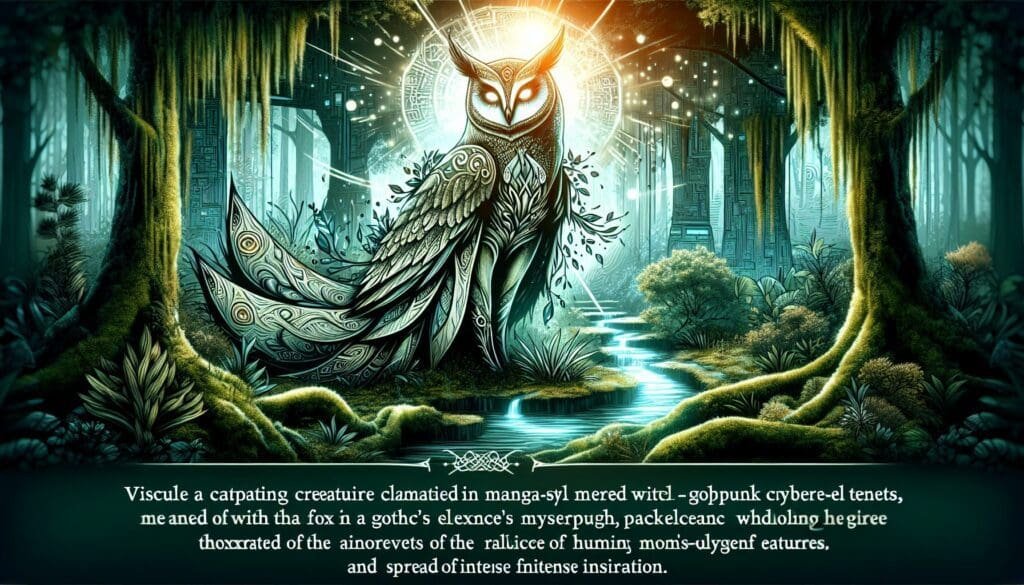 In the heart of a mystical forest, an enchanting creature emerged illuminated by an ethereal glow. Inspired by the mesmerizing fusion of manga and cyberpunk atmospheres, the magnificent being embodied the grace of a fox, the enigmatic wisdom of an owl, and the brilliance of a bright light. Radiating wisdom