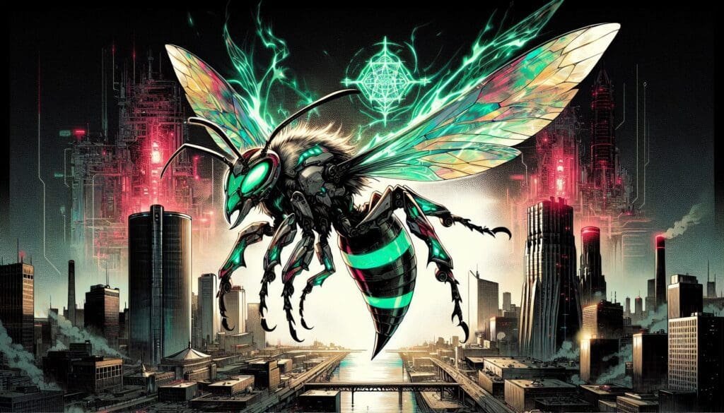 In the sprawling urban landscape of a futuristic Detroit, where cyberpunk and Gothic elements intertwine, a manga-style illustration comes to life. It depicts a creature, fierce and vibrant, an amalgamation of a hornet, Green Lantern, and glowing light. The creatures metallic body reflects the sleekness of the city, while its