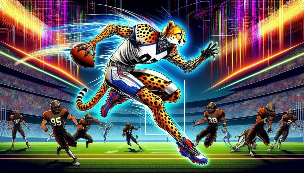 In a cyberpunk-inspired Gothic world, a Dallas Cowboy Football player beams with confidence on a manga-style illustration. Transformed into a cheetah, he possesses extraordinary speed and agility. With lightning reflexes, he leaps into the air, a graceful predator snatching a touchdown pass. Opposing players attempt to tackle him, but he