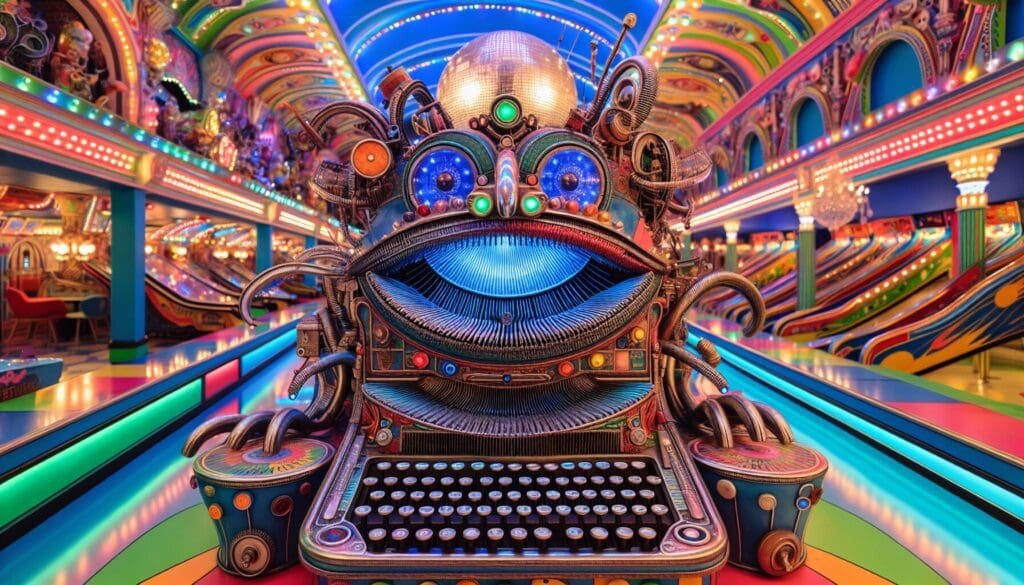 In a quaint corner of the arcade, awash in a Technicolor torrent of nostalgia, there existed a creature known only as Fun Mechanicafera. A singular spectacle, whimsically forged from a typewriter, a sewing machine, and a pinball machine, it was a wonder to behold. Its body bore the venerable aesthetics