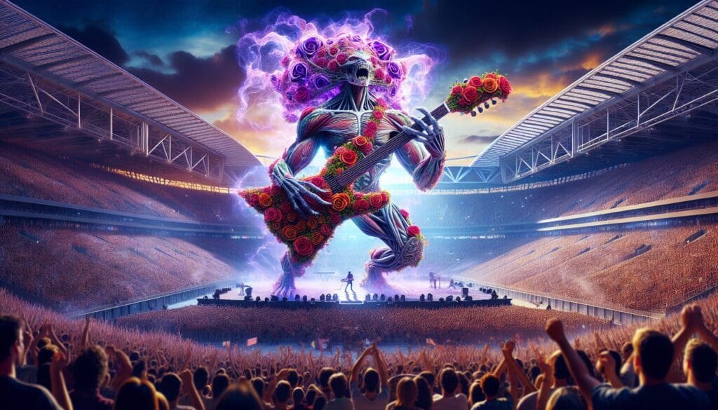 Amid the thunderous roar of a stadium packed to rafters with eager fans, an outlandish creature of grandeur and rock-stoked spirit emerges from the smoke and shadows. A culmination of the thunderous vibrations of rock music and the wild flights of a crowds imagination, it struts to the center stage,