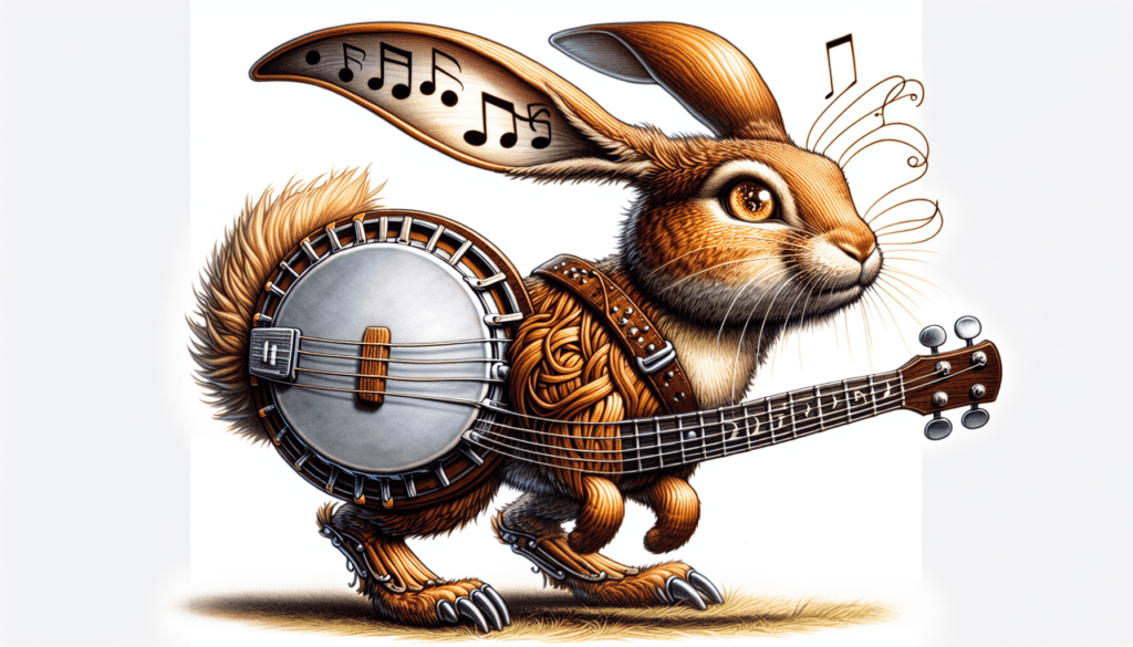 In Kentuckys song-filled landscapes dwells the StrumHare, a whimsical jackrabbit-like creature born of banjos and guitar picks. Its glossy, banjo-shaped body, guitar-string tail, and tuning peg ears create a melodic silhouette. Strumming rhythmic tunes on its belly with pick-tipped feet, it fills the wilderness with its enchanting symphony. Interesting Facts: