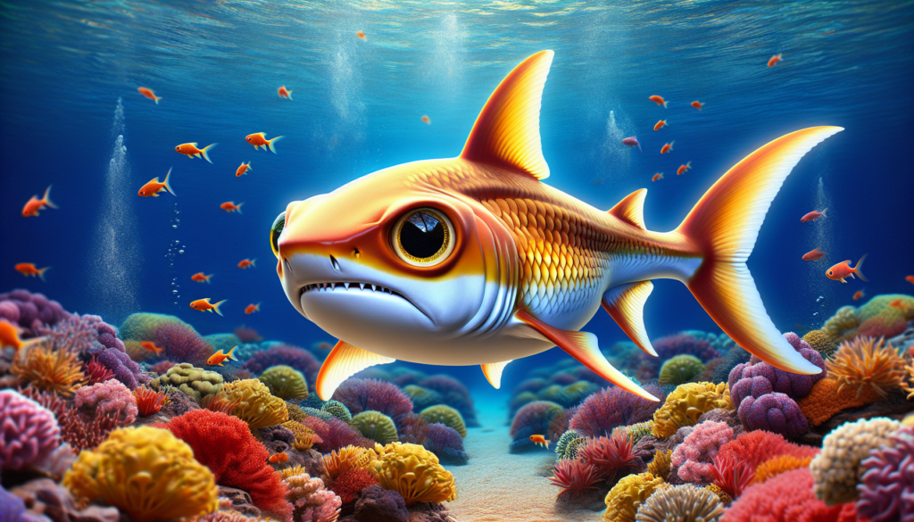In the heart of the mesmerizing ocean reef, a uniquely delightful creature called the GoldShark frolicked. The GoldShark, an enchanting combination of the sleek grace of a shark and the charming glimmer of a goldfish, spread cheer with every ripple it created. Elegant and swift, the GoldShark wore the ocean