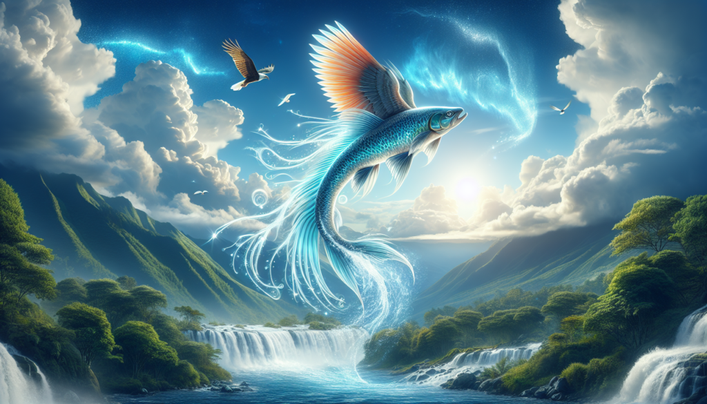 In Brazils azure skies, the Aquafluiran, an amalgam of waterfall, eagle, and trout, voyages majestically. Its gleaming trout-like scales dance with sunlight while the eagle’s potent wings and head radiate a fierce elegance. Its tail trails a peaceful waterfall, casting a sparkling mirage on the beguiling landscape below. Interesting Facts: