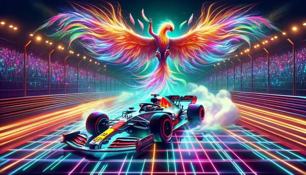 Against a backdrop of neon-lit grid cells, a majestic phoenix takes flight, its vibrant feathers mirroring the vivid hues of the raceway. Graceful and powerful, it embodies the spirit of a NASCAR Mustang race car, number 12. Perched on top of the cars roof, the triumphant driver waves to the
