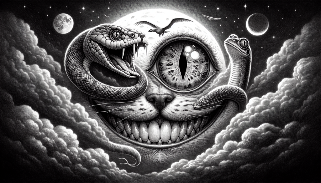 Among dark, swirling clouds, a sinister moon shrouded Mike Wazowski. Hauntingly transmuted, his iconic eye had become a spectral, bulbous orb akin to a frogs, carrying the cold gaze of a snake. His trademark smile now held the sly wickedness of a cat, far from his Pixar joviality, chilling to