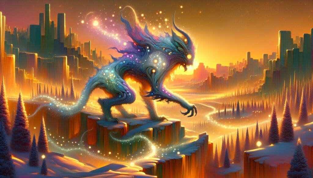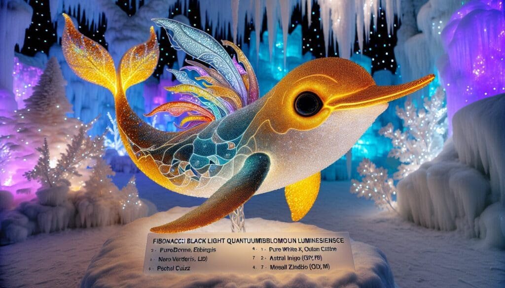 In the winter wonderland of Alberta, Canada, the FibonacciBlacklightQuantumBloomFrozenLuminescence creates a captivating and playful experience. Neon golden sunlit citrine lighting bathes the landscape in a warm and radiant glow, while tiny points of light dance and sparkle through the ethereal nanopointillism technique. The fantastical being that resides here is a