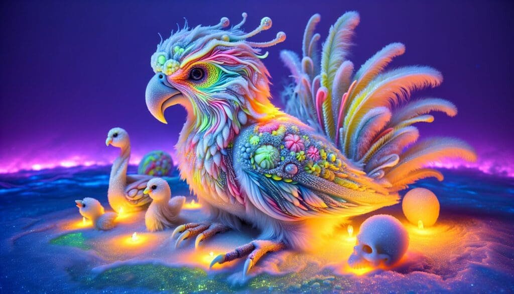 In the marvelous realm of the FibonacciBlacklightQuantumBloomFrozenLuminescence lives a fantastical creature, a playful amalgamation of a gofer, parrot, and swan, peacefully coexisting within its unique being. Its appearance is nothing short of captivating, enveloped in a neon golden citrine glow that bathes its surroundings. A touch of ethereal nanopointillism technique