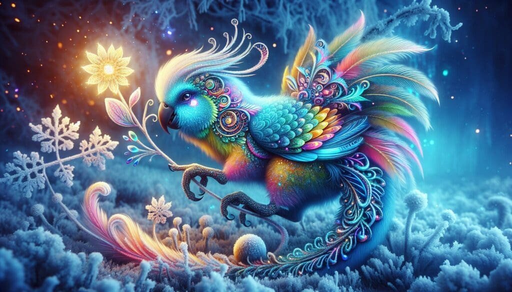 In this mysterious wintery wonderland known as FibonacciBlacklightQuantumBloomFrozenLuminescence, an extraordinary hybrid creature emerges. Combining the features of a chipmunk and a parrot, it becomes a sight to behold. Residing in a realm of vibrant parrot-inspired colors, it revels in the enchanting glow of citrine neon lighting and the ethereal technique
