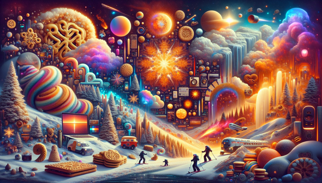 This is like a galaxy of the world’s coldest yet most colorful and tasty things combined with snow skiing. AI weirdness yet beautiful.