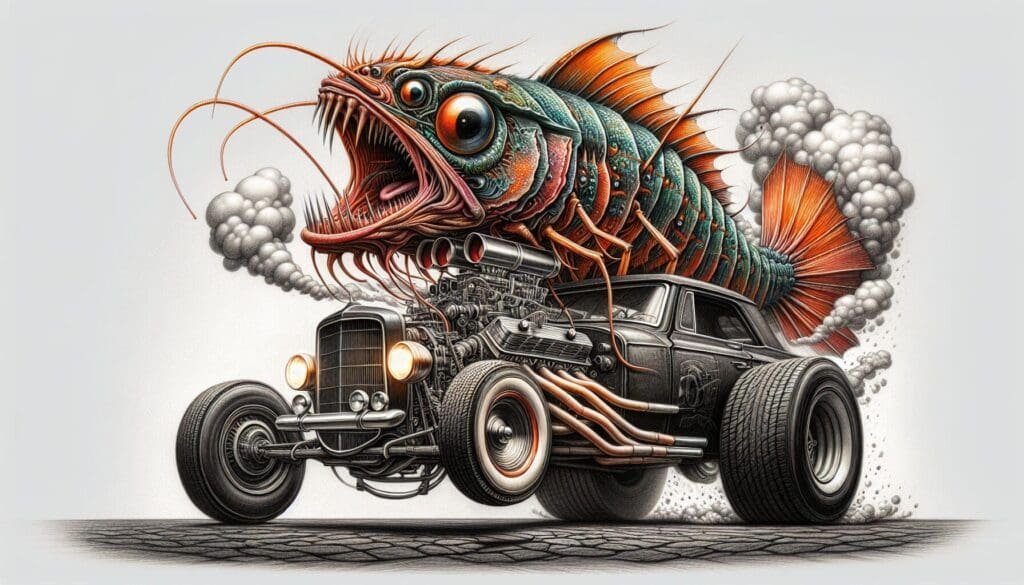 A peculiar panorama in pencil unfolded on the pristine sheet of drawing paper. An outlandishly oversized entity, conceived from the unusual union of a rabid shrimp, a clamshell, and a cheerleader, flamed with a lively combustion. Its exoskeleton gleamed with the vibrant hues of an old patina, offering a startling