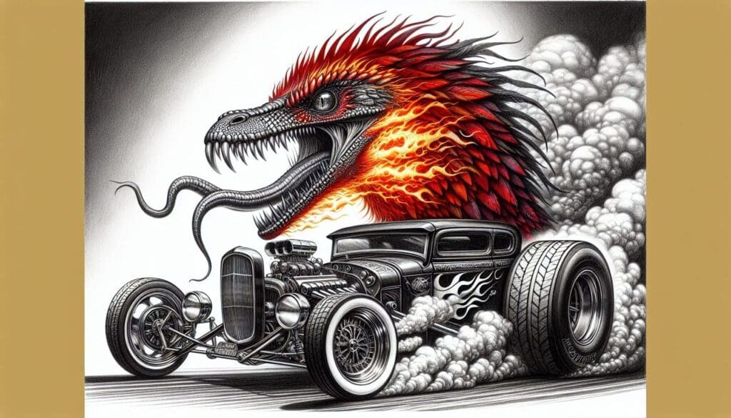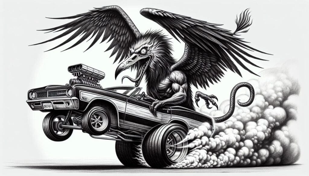 The monstrous mongoose-snake hybrid roared, engulfed in flames. Bulging eyes flashed dangerously as its tongue slithered recklessly. Gripping the wheel of a black and white muscle car, it launched into motion, rear wheels engorged, front tiny and airborne, dust trailing a fierce wheelie. The iron beasts engine sputtered steam, the