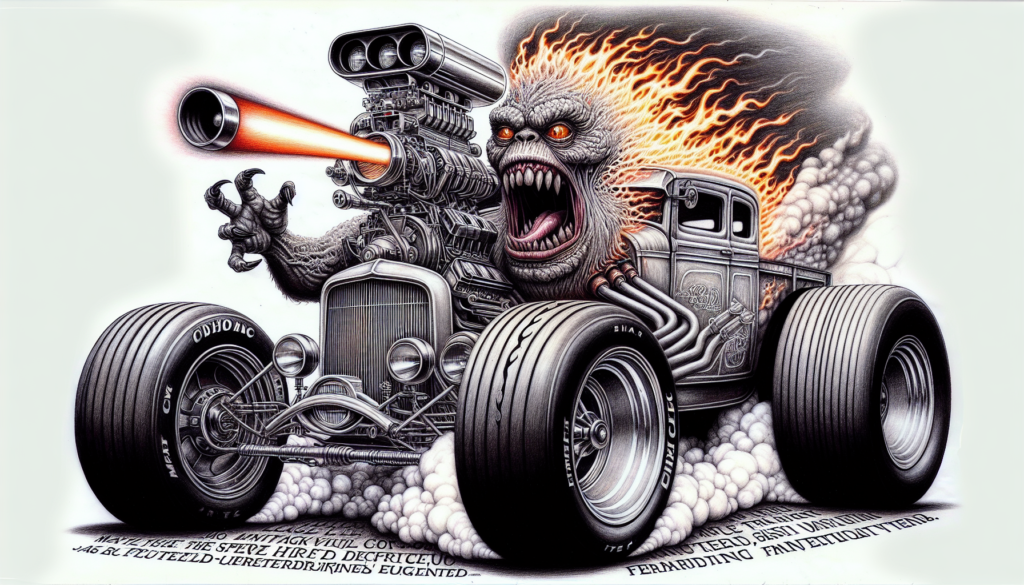 In a roaring blaze, the monstrous fusion of Adams family Hurst, Munsters car, and 40 Ford Roadster came to life, flames etching its scarecrow grin. Its bulging eyes radiating thrill, the creature stomped on the gas, catapulting the black and white muscle car into a spectacular wheelie. Steam belched from