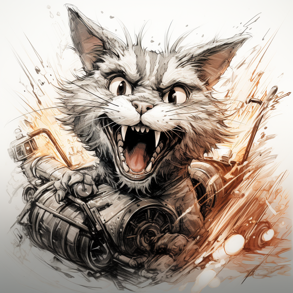 In a surreal landscape, a zany creature roars to life. A mind-bending blend of mouse, cat, dog, it leaps into an oversized hot rod, its massive paws gripping the wheel. It blitzes forward, wheels aloft, engine screaming defiance at the mundane. Flames dance wildly, eyes blaze with untamed joy. Power.