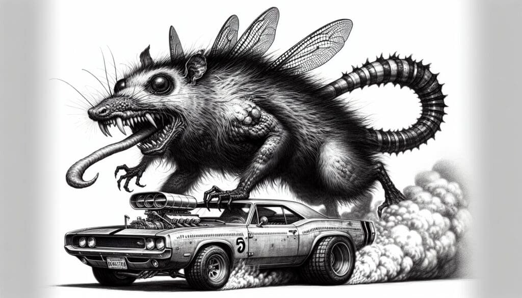 Aragog, an abomination of nature, roared through the desolate backroads. His monstrous form was a deranged amalgamation of a rabid possum, flying squirrel, and dragonfly. Bulging eyes gleamed with inhuman animalistic fury, his draconic wings flickering with iridescent color, while a long, grotesque tongue dangled obscenely from his rabid possum
