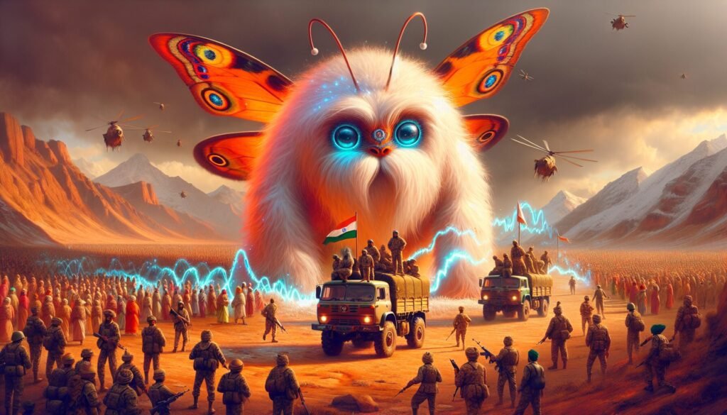 In the heart of India, a magnificent and fearsome creature emerged, unlike anything the world had ever seen. A wondrous fusion of a butterfly, a yeti, and a snowman, it stood tall and proud, its unique and otherworldly features captivating all who beheld it. Despite its imposing presence, the creatures
