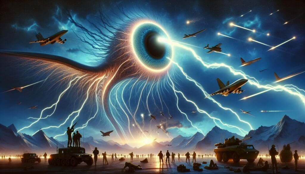 In the heavenly expanse, a mythical creature forms, its eyes big and expressive, embodying the essence of a jet airplane, meteor, and chemtrail. Suddenly, a powerful surge of 220 volts startles the creature, causing its body to visibly react. Soldiers from the army unleash electrical jolts from multiple vehicles, reminiscent