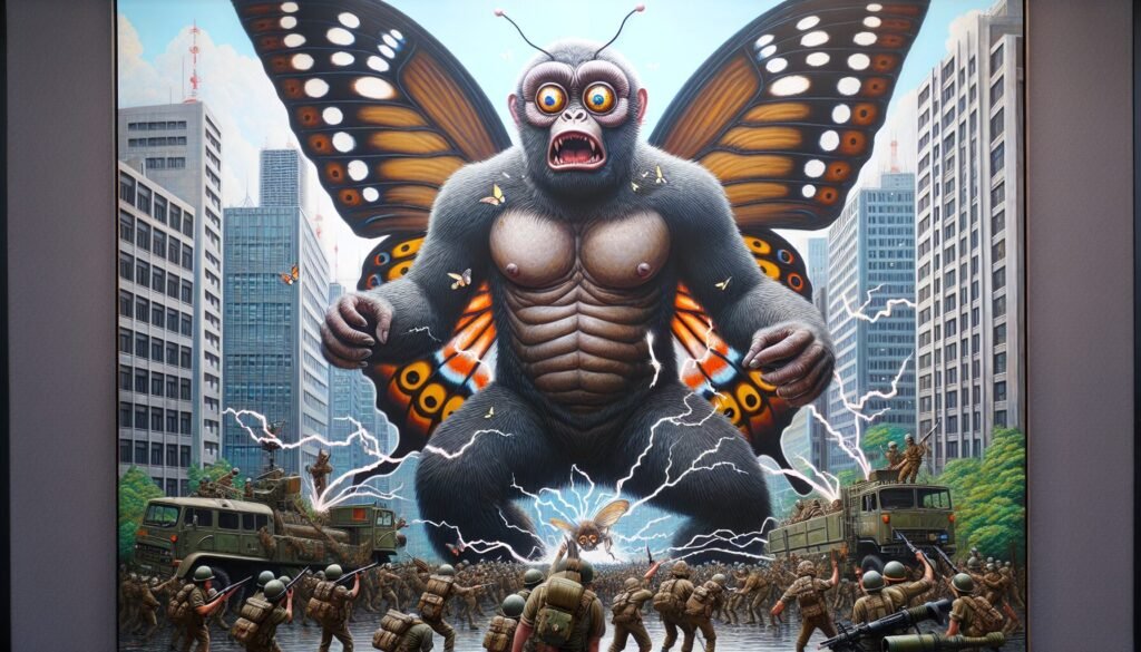 In the heart of Tokyo, a colossal creature, a bizarre fusion of Bigfoot, delicate butterfly wings, and a chipmunk, loomed over the scene with its immense size. Its eyes, large and expressive, widened in shock as 220 volts of electricity surged through its body. The jolt sent visible waves of
