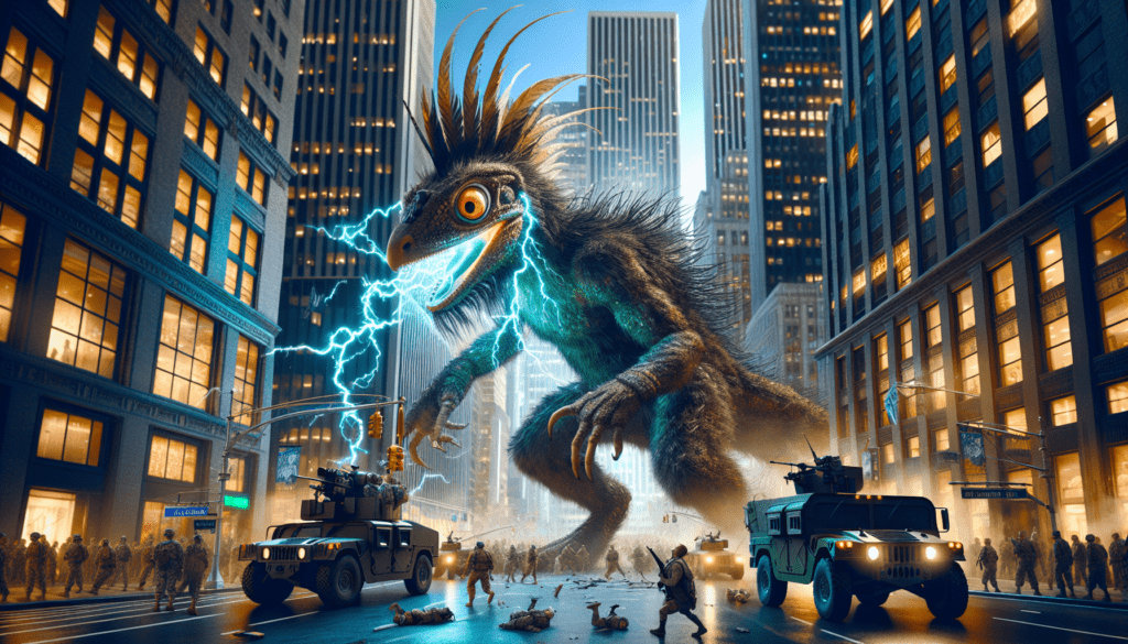In the beating heart of New York City, amongst the dominating skyscrapers, a creature of tremendous size and wonder commanded the attention of the world. It was a hybrid of pure fascination and destructive potential; a seamless amalgamation of a peacock, rat, and lizard. The creature bore the resplendent feathered