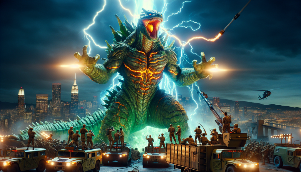 Dusk settled over Tokyo, a swarming metropolis now under the shadow of an unimaginable terror. The monstrous being cut a silhouette against the moon, an imposing hybrid of Godzillas primal bulkiness, the Green Giants robust vitality, and the colossal aggression of an alligators tail. With every ritualistic swish of the