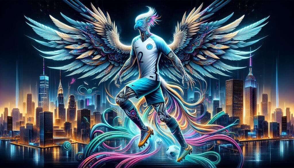 In a bustling and vibrant cyberpunk-inspired cityscape, a captivating manga-style illustration takes center stage. The artwork unveils a glorious creature, gracefully showcasing the harmonious blend of a phoenix and a skilled footballer. Adorned in a stylish football uniform that reflects popular street-wear brands, this mystical being impeccably balances athleticism and