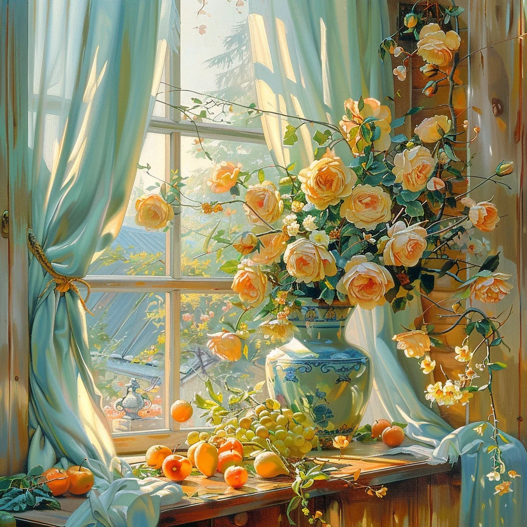 The flowers, a mix of daisies, tulips, and peonies, capture the essence of the season. Their petals glisten with morning dew, and their gentle fragrance fills the air, blending perfectly with the sweet smell of dough rising in the oven. The morning sun streams through the window, casting a warm glow on the scene and creating a sense of tranquility and contentment.