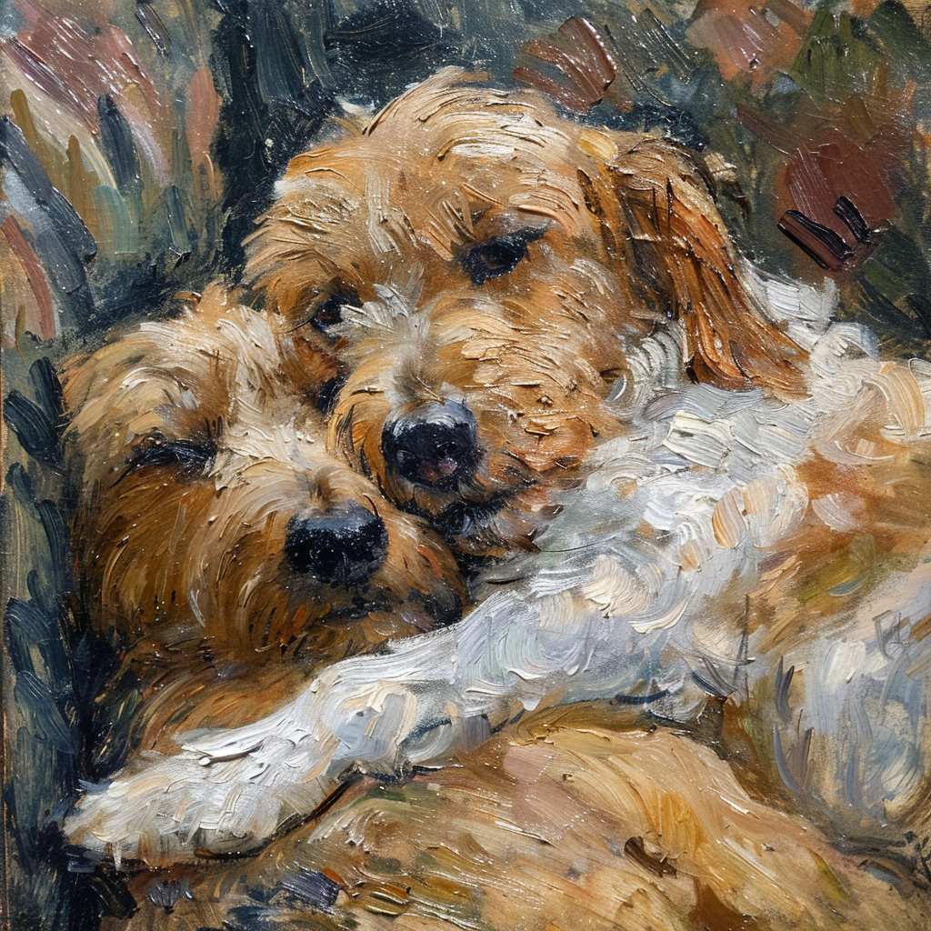 The golden retriever’s large, gentle paw rests protectively on the spaniel’s back, creating a sense of security and closeness. Their bodies are intertwined in a perfect picture of canine companionship, their breathing synchronized in a peaceful rhythm. The golden retriever occasionally nuzzles the spaniel’s head, and the spaniel responds with a soft sigh, shifting slightly to get even closer.
