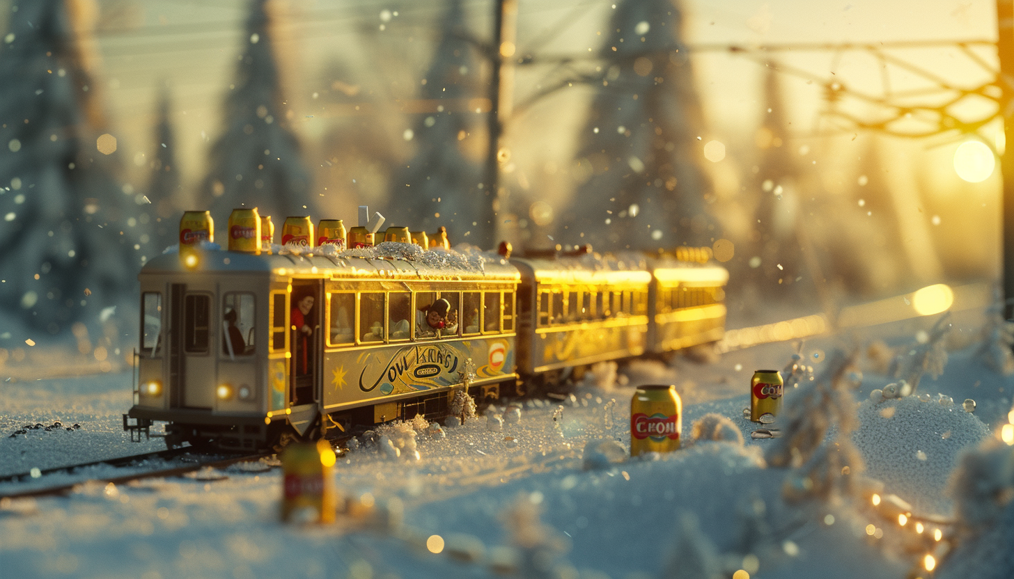 A Love Train sculpted from Coors cans shines amidst unexpected snow on the beach, its silver glint mirrored by smiling, groovy folk in retro fashion. With a backbeat of the sixties and seventies, they dance, sing, and play in the frost, oblivious to the chill. From its stack, the train releases heart-spun flakes, adding a touch of wintry love to the surreal scene.