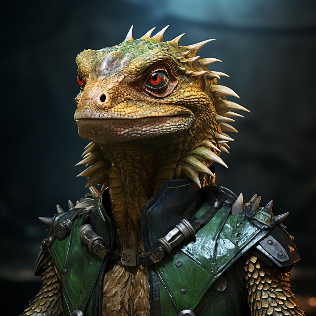Captain Kralg, a stately alien hybrid commanding the Star Trek Enterprise, melds Klingon intensity, alligator fortitude, and lizard tenacity. His formidable warrior persona, wrapped in Starfleet gold, subtly adorned with a hybrid insignia, juxtaposes with his compassionate gaze, presenting a powerful, yet reassuring, figure to the young trekkers.