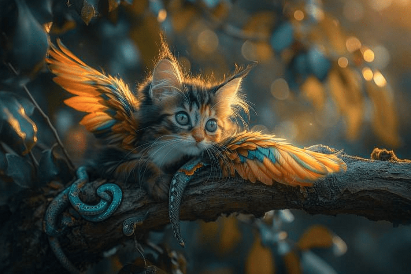 In a forgotten corner of an enchanted forest, resided an extraordinary creature, a splendid anomaly of nature. Its existence was an uncanny amalgamation of elements from a cats furry torso, a pair of vibrant wings borrowed from a bird, and a playful serpent tail. To the untrained eye, it might appear odd, bizarre even, but if observed closely, it exuded a sense of whimsical charm.